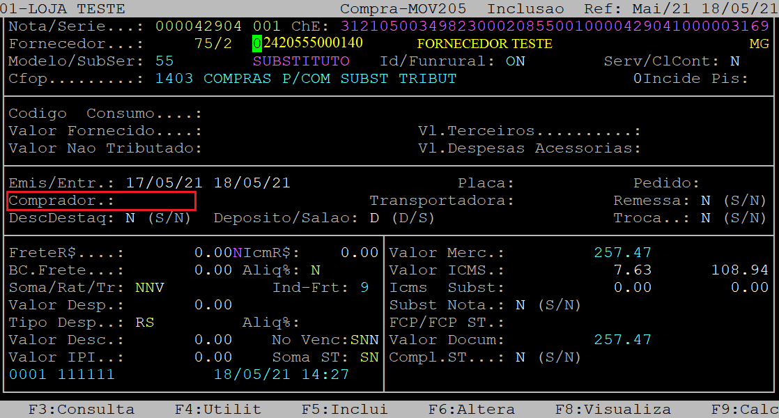 Ao alcançar o campo Comprador, informe o código cadastrado no sistema e, pressione a tecla Enter para prosseguir até confirmar a primeira tela.