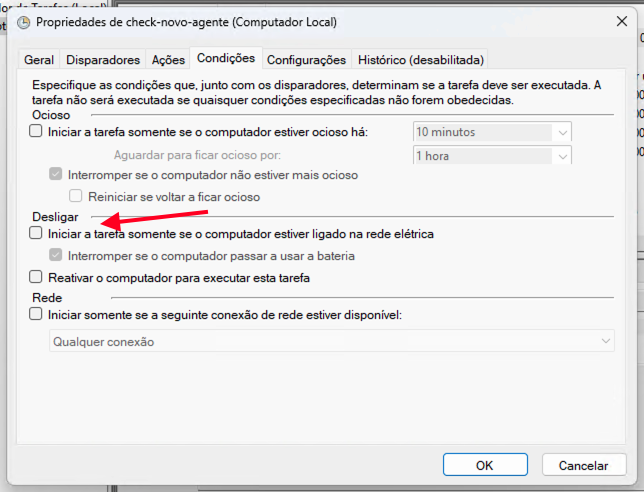 - Certifique-se que o checkbox "Iniciar a tarefa somente se o computador estiver ligado na rede elétrica" esteja desmarcado.
