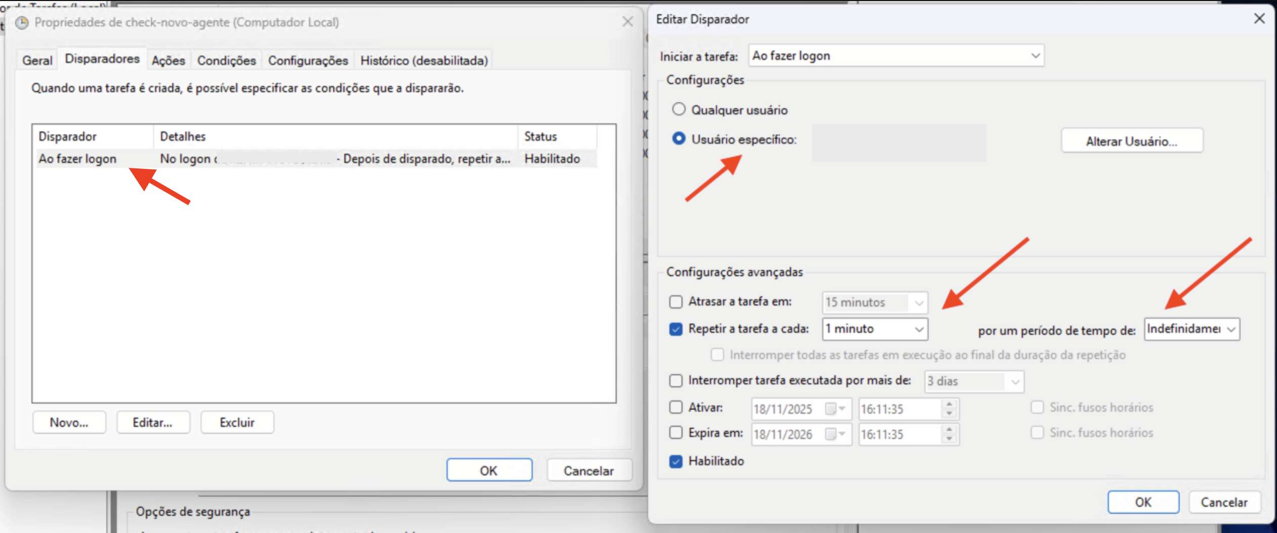 - Marque o checkbox "Repetir a tarefa a cada", em selecione 5 minutos