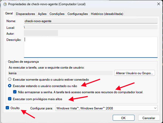 - Marque o checkbox "Não armazenar a senha. A tarefa terá acesso somente aos recursos do computador local."