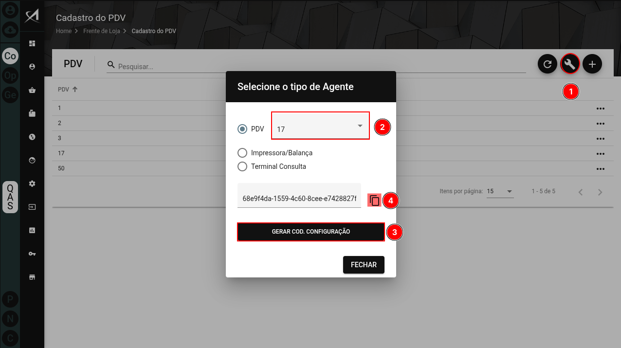 Na rotina "Cadastro do PDV", (1) clique no botão "Gerar código de configuração do Novo Agente", (2) selecione o número do PDV, (3) clique no botão "Gerar Cod. Configuração", (4) copie o código de configuração.