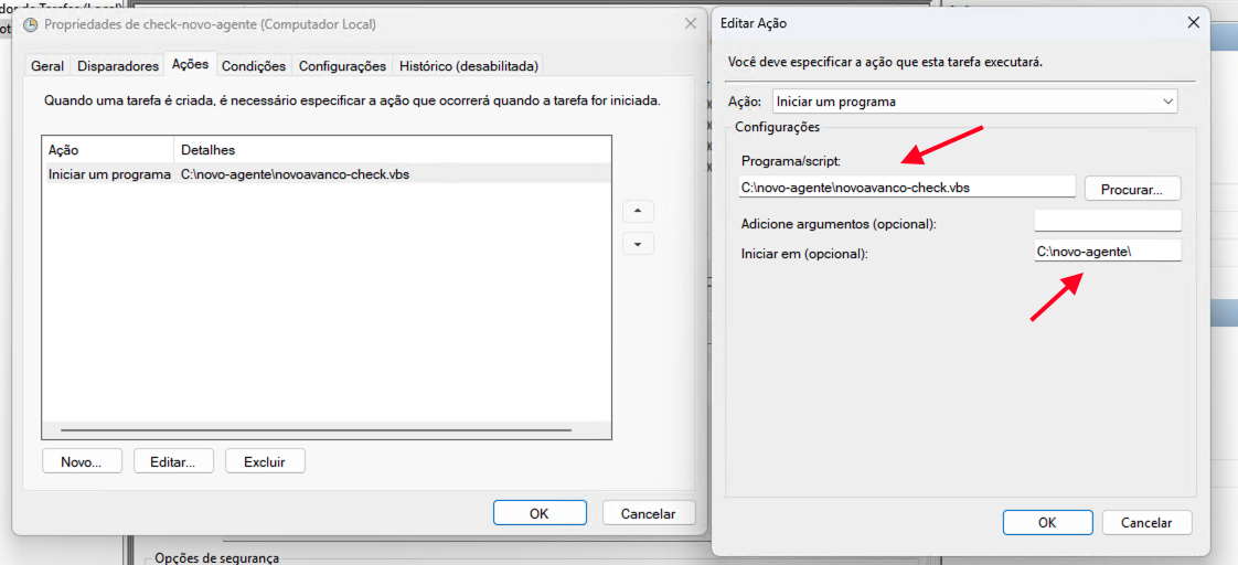 - Em Programa/script, busque o arquivo checa-novo-agente.vbs no botão "Procurar..."