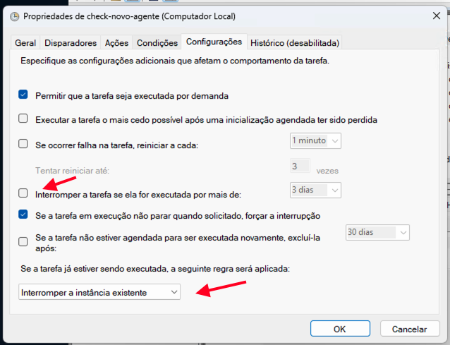 - Na opção "Se a tarefa já estiver sendo executada...", selecione "Interromper a instância existente