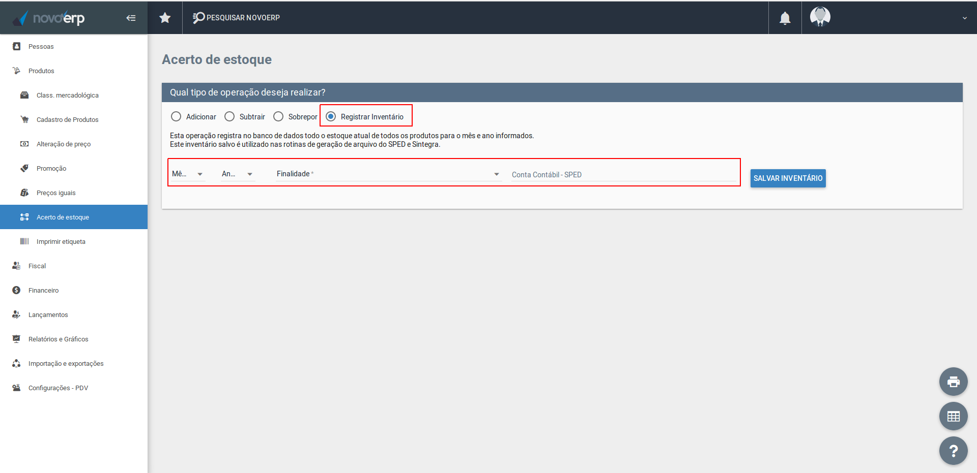 Ao acessar a rotina, o sistema abrirá a tela de Acerto de estoque, no qual deverá marcar a opção Registrar Inventário, conforme o exemplo abaixo. Em seguida, selecione o mês, o ano e a finalidade (motivo) desejados para criar e enviar o inventário, assim como a conta contábil referente ao inventário que deseja enviar no Sped. Ao finalizar, clique no botão SALVAR INVENTÁRIO.